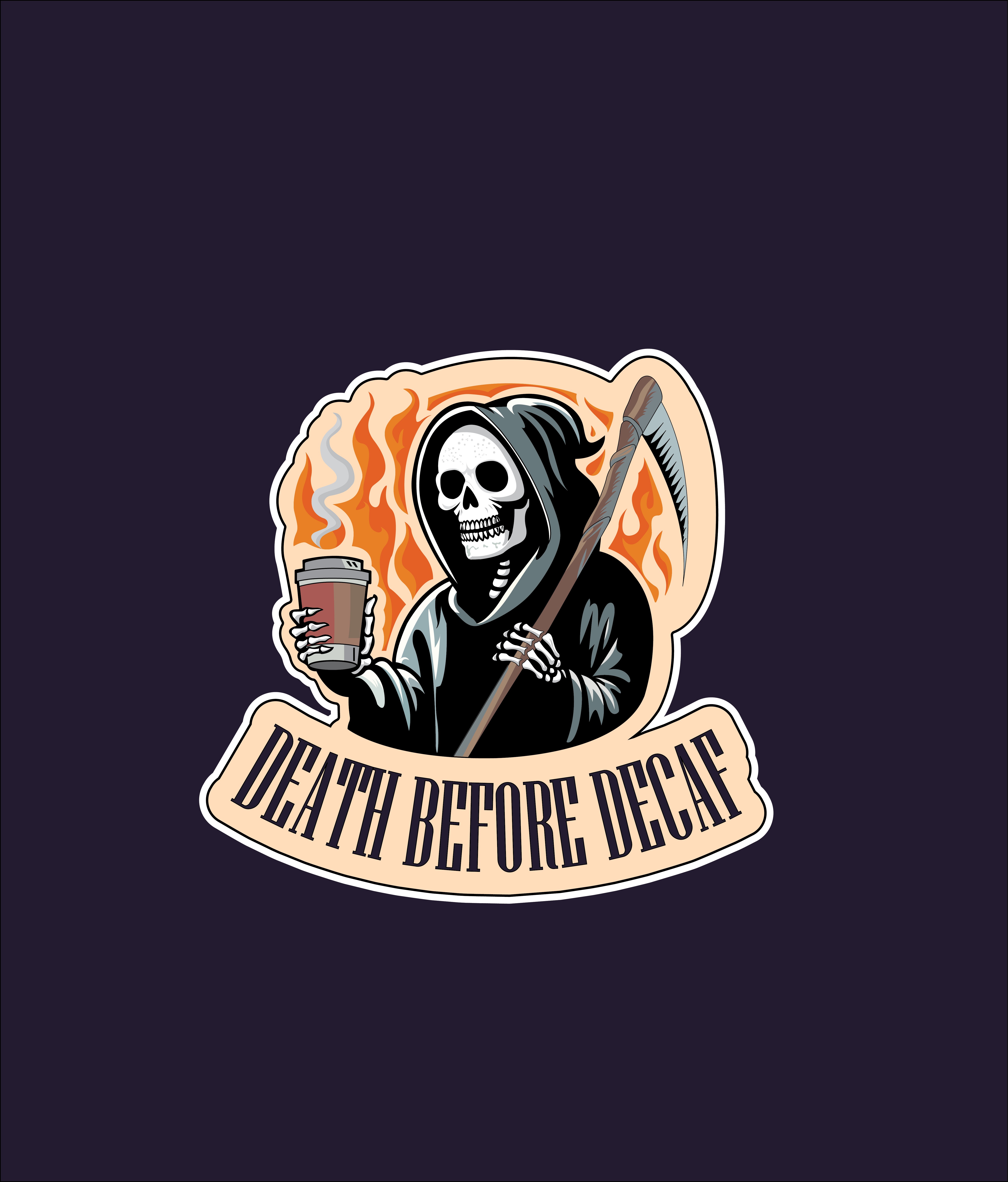Retro-futuristic design oddities Stickers, posters, and coffee-loving reapers